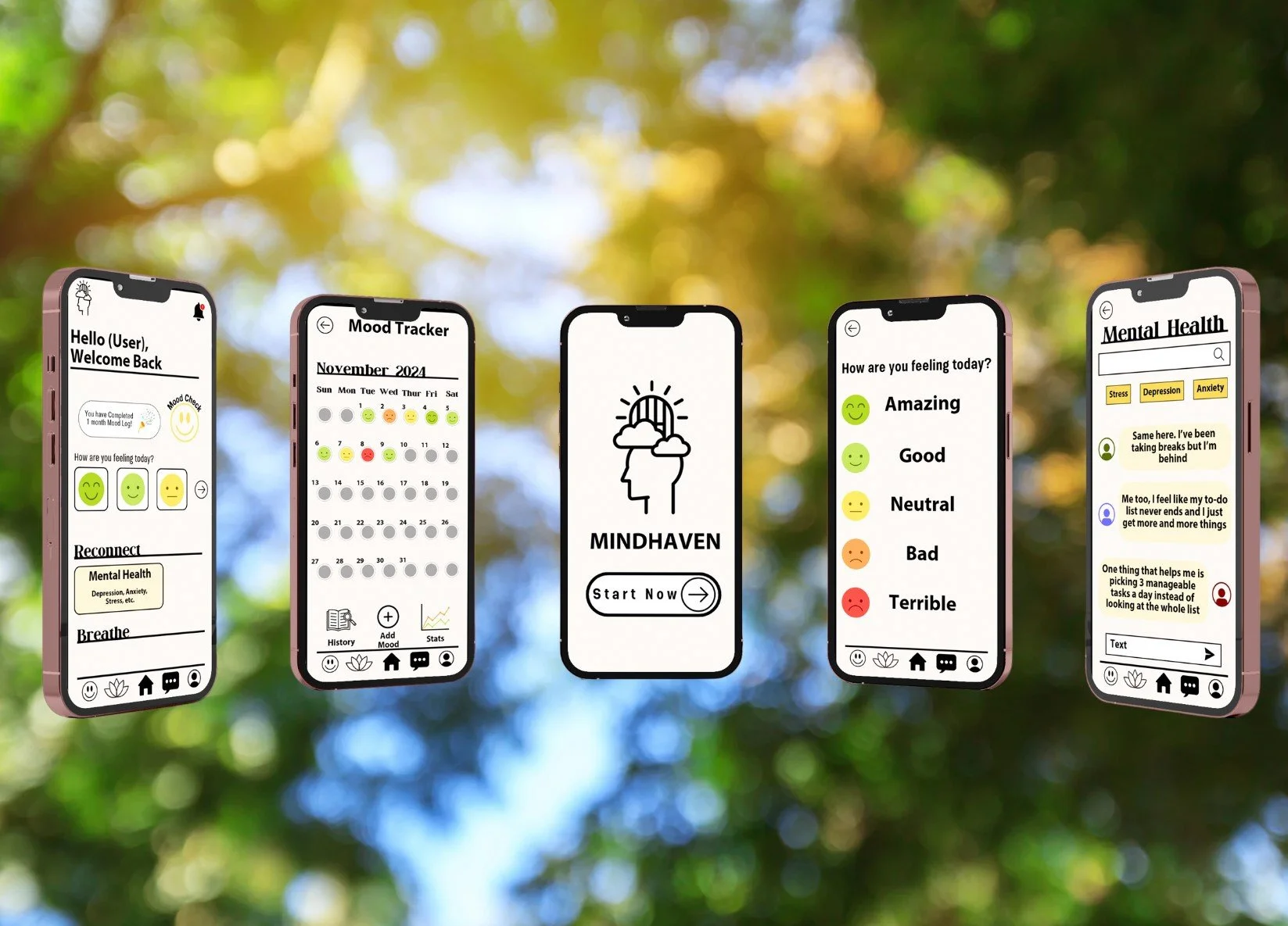 For this Project, I created MindHaven to offer accessible, flexible mental health support for those who find traditional therapy expensive or intimidating. With features like mood tracking, self-compassion exercises, and virtual support groups, the app helps users build resilience, manage anxiety, and develop healthier habits on their own.